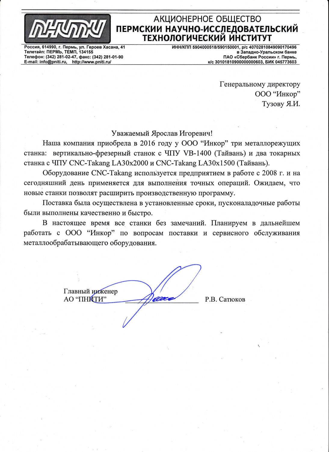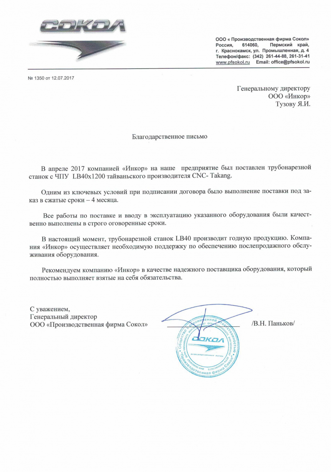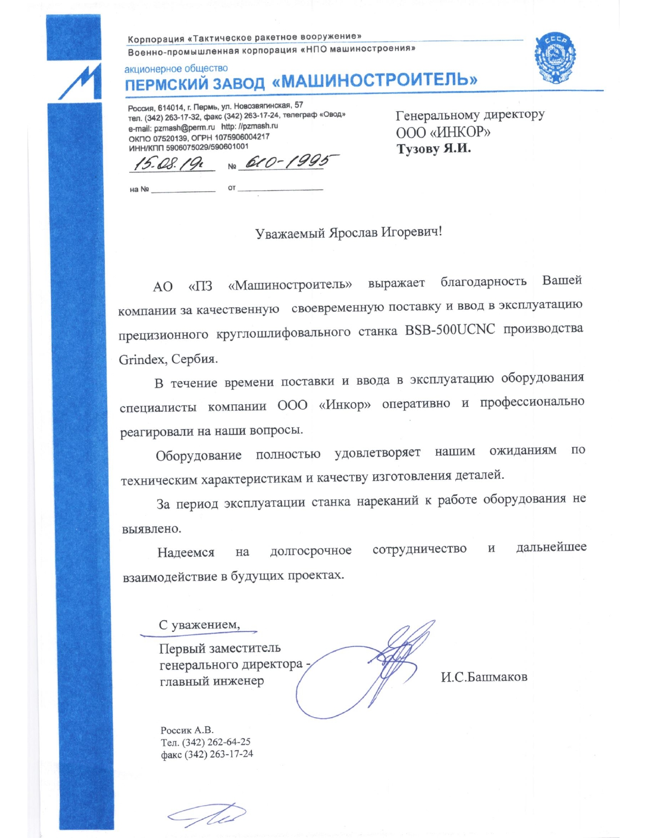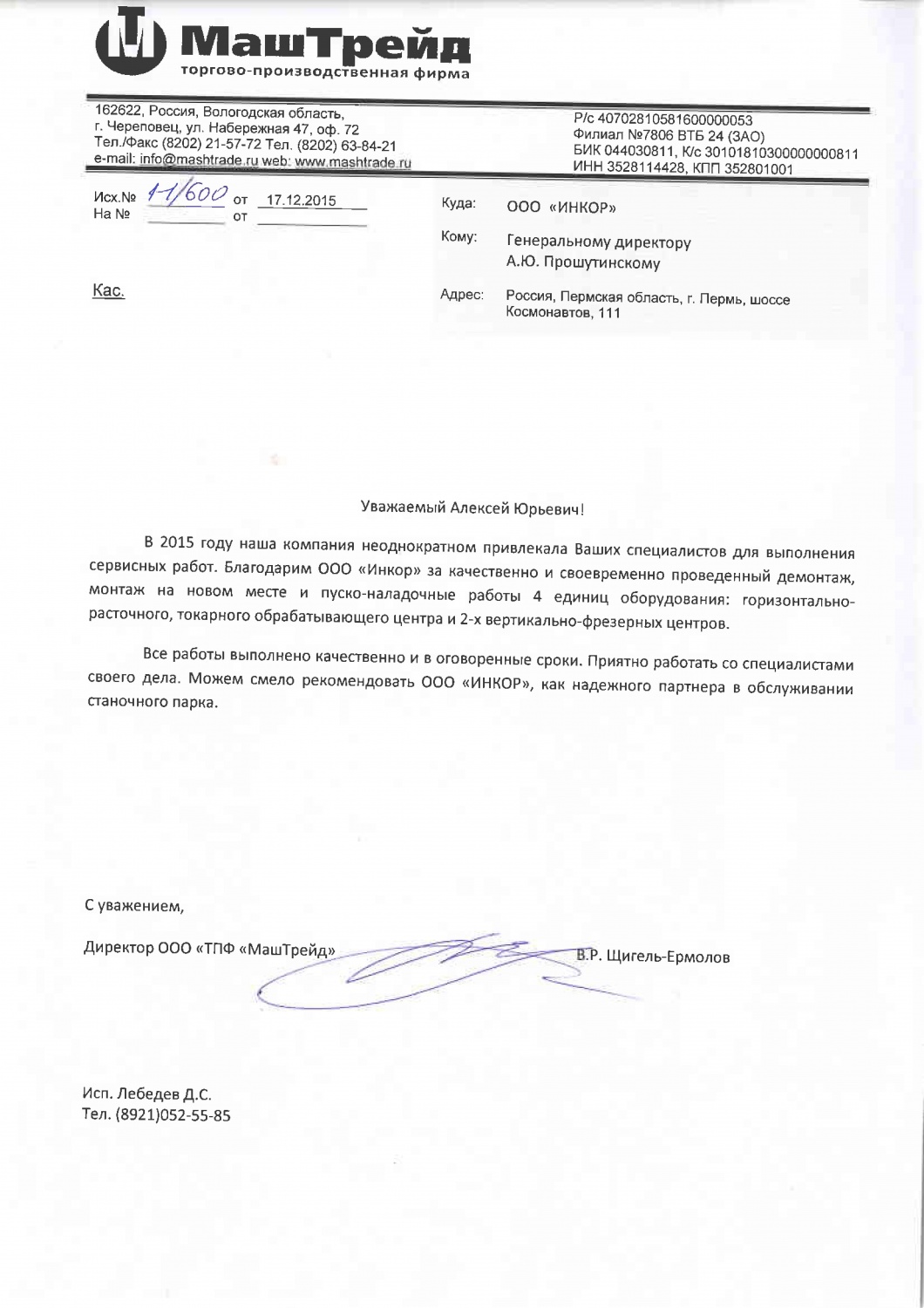 Мы искренне благодарим Вас и вверенный Вам коллектив за качественную и оптативную техническую поддержку со стороны ваших специалистов. Благодаря их высочайшей квалификации и профессионализму были решены в минимальные сроки абсолютно все поставленные задачи связанные с обеспечением работоспособности нашего оборудования с ЧПУ.