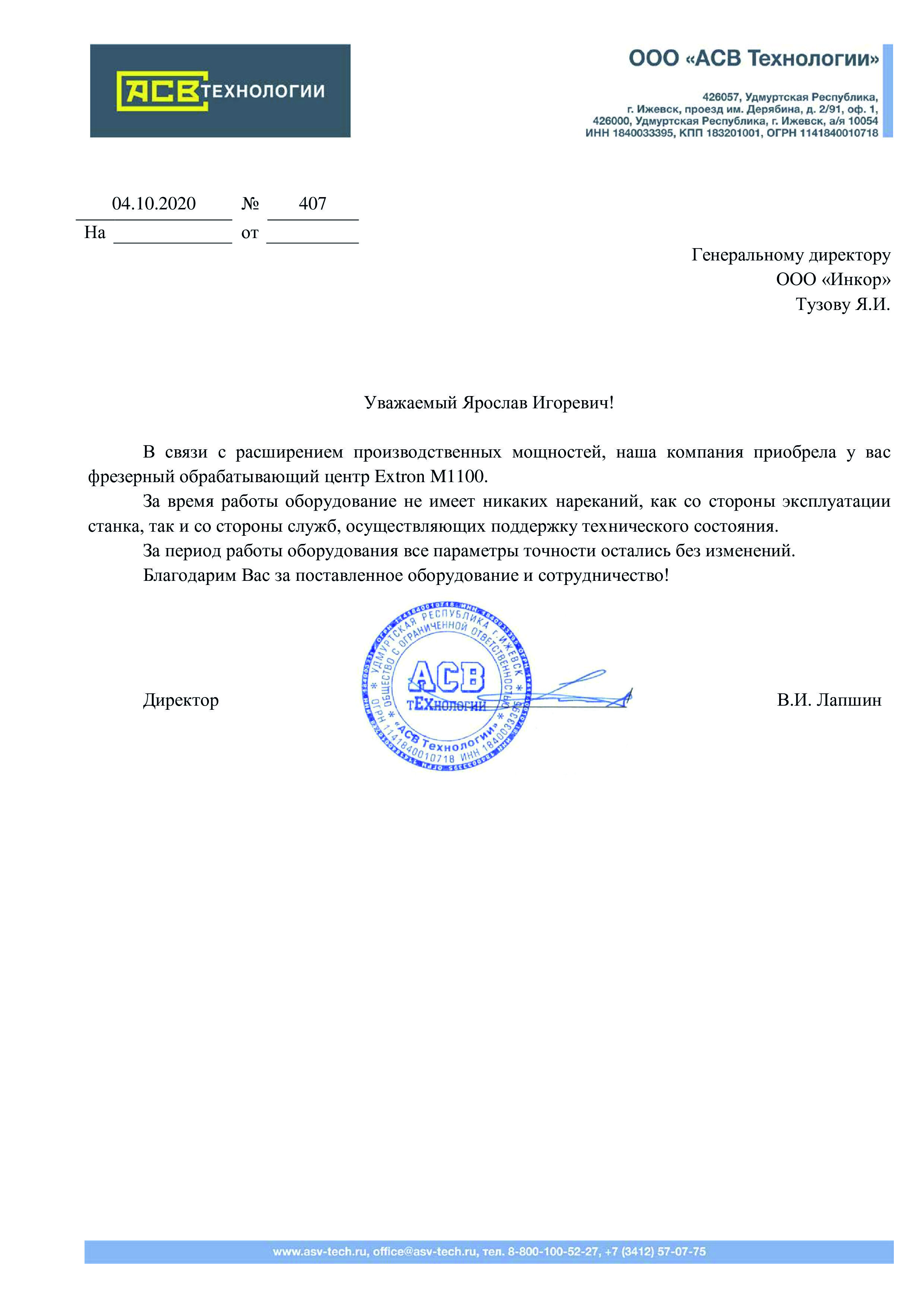 В связи с расширением производственных мощностей, наша компания приобрела у вас фрезерный обрабатывающий центр Extron M1100.